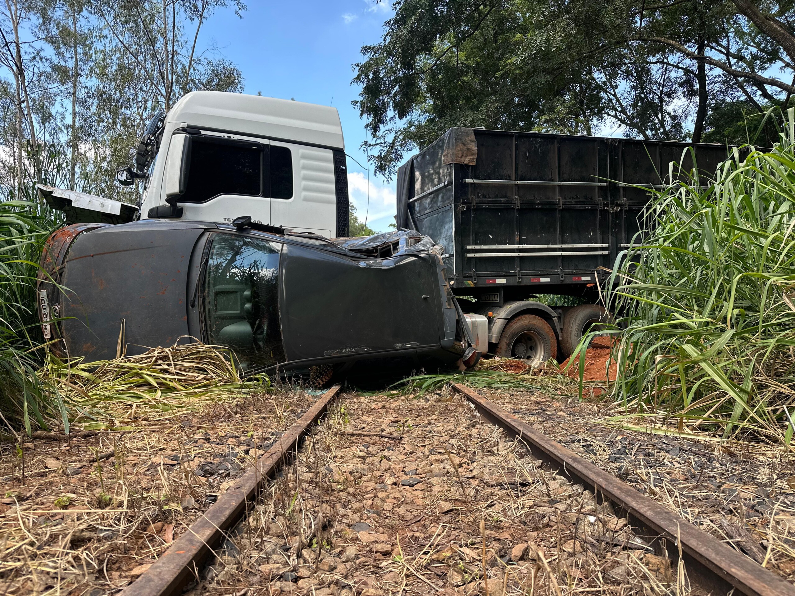 Nesta quarta-feira (11), a SMT e a Defesa Civil foram acionadas para atender uma ocorrência no Distrito Agroindustrial de Senador Canedo, onde um caminhão carregado com vigas de ferro atingiu quatro veículos e parou sobre uma linha férrea.