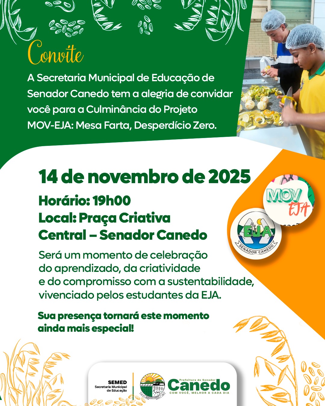 A Secretaria Municipal de Educação realiza nesta sexta-feira (14), às 19h, na Praça Criativa Central, o encerramento do projeto MOV-EJA – Mesa Farta, Desperdício Zero. O evento vai reunir alunos da Educação de Jovens e Adultos com receitas criativas feitas a partir do reaproveitamento de alimentos, mostrando que é possível transformar sobras em pratos nutritivos e saborosos.