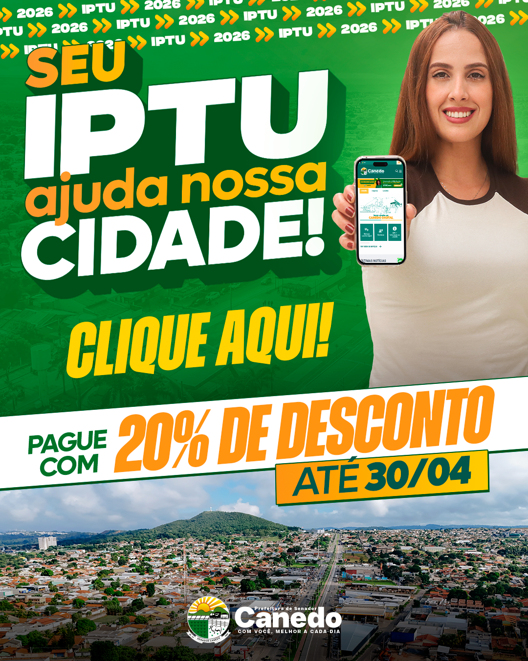 A campanha para pagamento do Imposto Predial e Territorial Urbano (IPTU) do ano de 2024 já está disponível em Senador Canedo. Quem não recebeu o carnê em casa, pode consultar pela internet no site oficial da prefeitura, na aba contribuinte com o número do CPF.