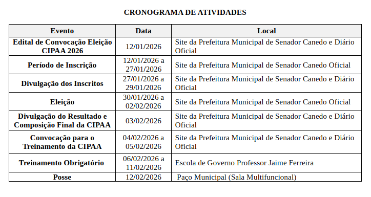 A Prefeitura de Senador Canedo convoca os servidores municipais para participarem da Eleição da Comissão Interna de Prevenção de Acidentes e Assédio (CIPAA), referente à gestão 2026/2027. O edital de convocação foi publicado no Diário Oficial do Município, e o período de inscrições ocorre de 12 a 27 de janeiro de 2026.