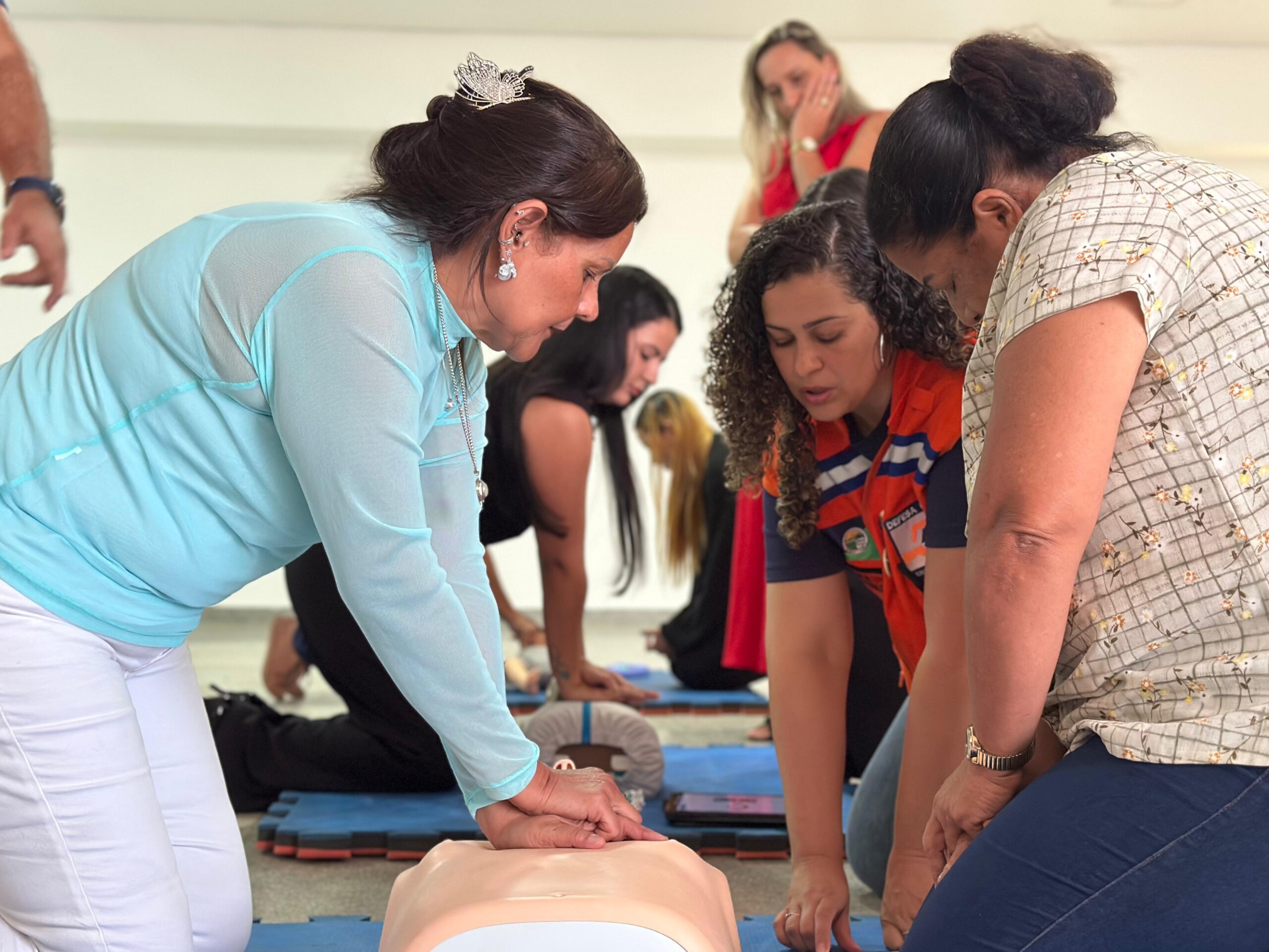 Durante o treinamento, os participantes receberam orientações práticas sobre como proceder em casos como desmaios, quedas, engasgos e outras ocorrências que podem acontecer no dia a dia dos atendimentos ao público.