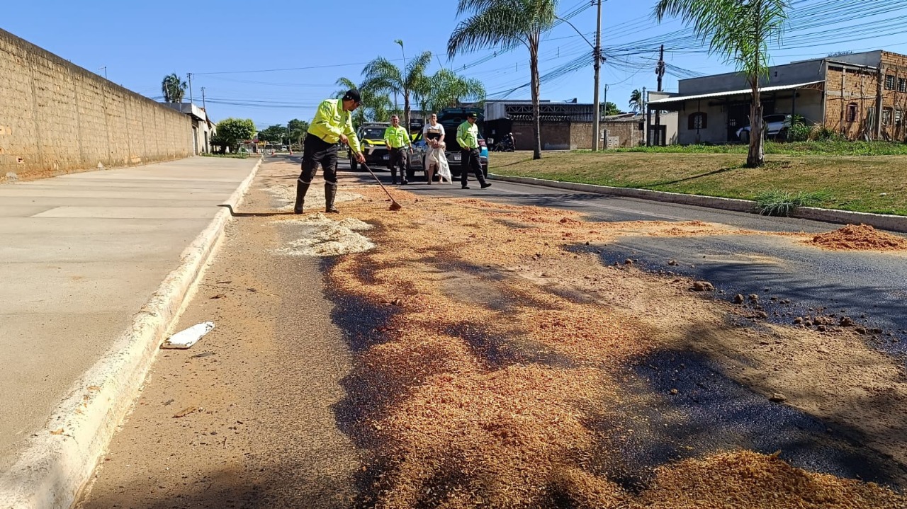 Durante a ação, o Corpo de Bombeiros foi acionado para auxiliar na limpeza e contenção do produto derramado.